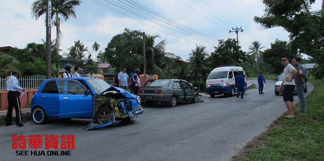 砂拉越中砂 2车踫撞 车头毁损 2015年8月21日 车祸发生后,两辆轿车的车头撞毁。 (本报沐胶21日讯)两辆轿车疑不慎发生踫撞,导致双方的车头撞毁。Advertisement 该宗车祸于今天上午10时至11时之间,在甘榜瓜拉拉曼一带的道路发生。 据悉,普腾赛佳轿轿车有一对夫妇及1名孩子,3人在这场车祸中没有受伤,而另一辆蓝色轿车车主则是腿部受伤。 事发后,接到消息的警员赶往现场了解情况并指挥交通。