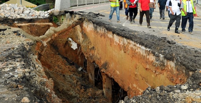 根据公共工程局在《面子书》发表的文告指出,文冬新村大桥往吉隆坡方向的路中央,因路陷而形成一个大洞。涉及范围达20公尺,而大洞的高度达5公尺。