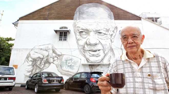 (怡保11日讯)怡保旧街场「老人嘆咖啡」壁画因肖像人物被指貌似马共领袖已故陈平闹出「陈平风波」而倍受瞩目,如今壁画老人林炳瑞远从檳城到来壁画前,让眾人亲自作比较和验明正身,并且对陈平风波的幼稚言论一笑置之。