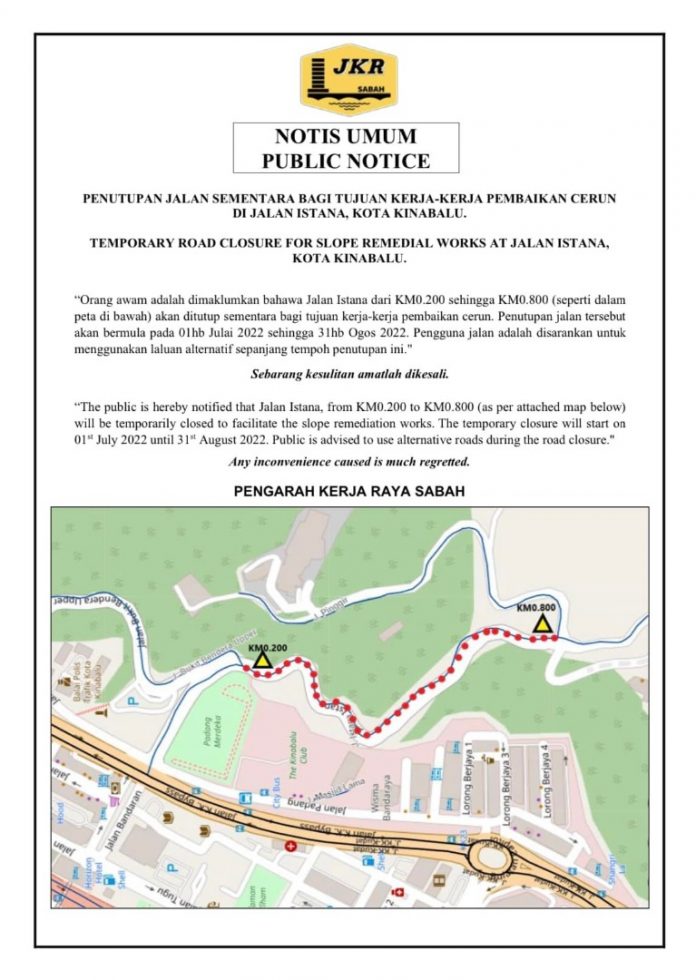 (亚庇9日讯)亚庇升旗山-州元首府路段自本月1日起关闭直至8月31日,以进行斜坡路面保养工程,促请公路使用者垂注!