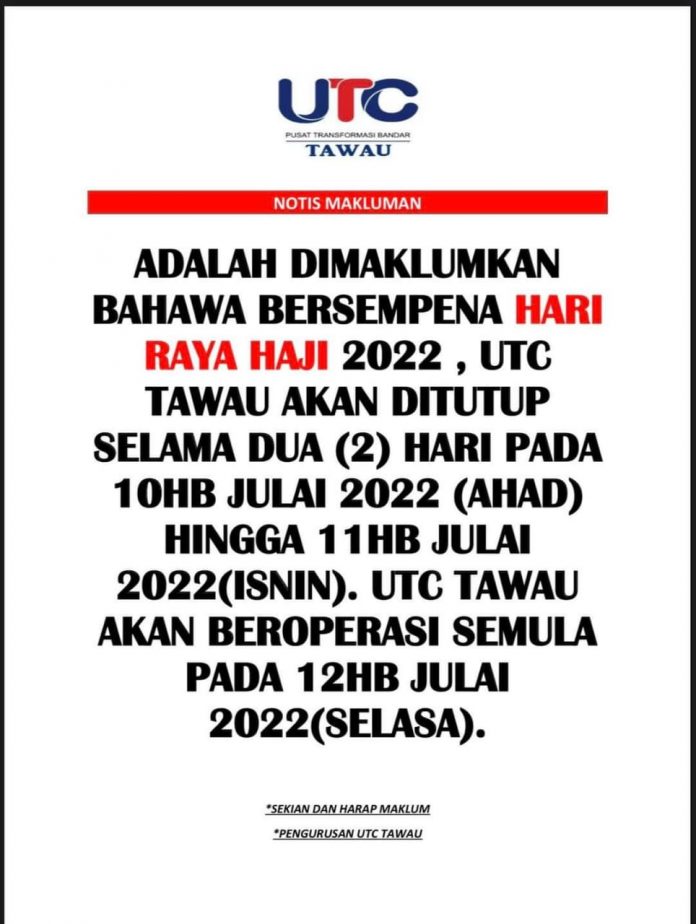 (本报斗湖10日讯)配合公共假期,沙巴城市转型中心(UTC)周六已经贴出通告将会停止运作两天,斗湖城市转型中心今日也慢人一拍,在周日早上八时也通过脸书公告民众将会停止运作两天。