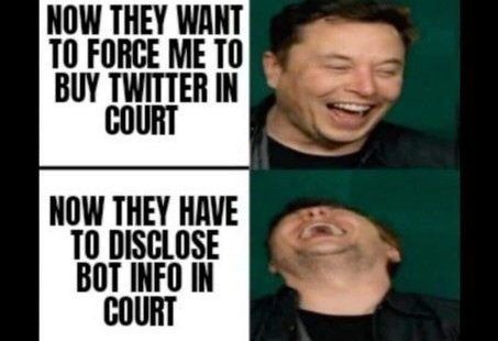 马斯克周一 (11日) 在推文中放了自己狂笑不止的四连拍照片,并依序附上图说「他们说不让我买推特」、「他们又说不会披露机器人帐号资讯」、「现在他们想上法庭强迫我买推特」、「现在他们得在法庭上披露机器人帐号资讯」。