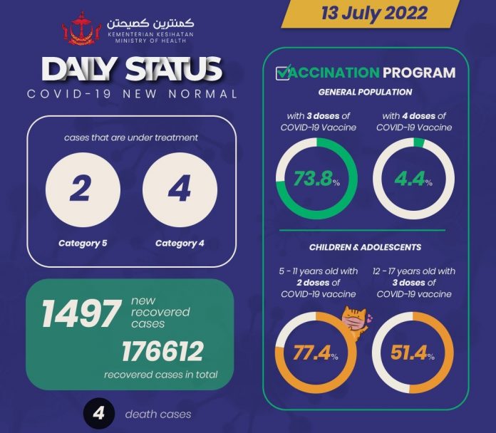 (汶莱斯市13日讯)汶莱今日的冠病第4级及第5级病情病例个别为4宗及2宗,同日有1497宗新痊愈病例,目前全国累计痊愈病例共17万6612宗。
