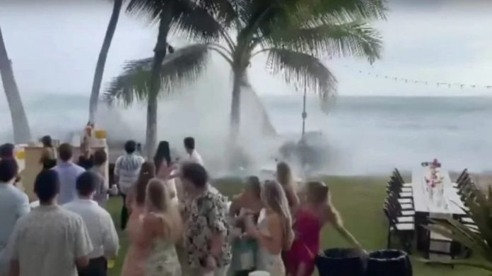 一对新人于周六晚上在科纳举行的婚礼因此被打断,大浪越过屏障并将桌椅冲向客人。