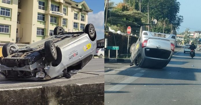 砂拉越中砂 为闪避一只狗 诗巫1轿车四轮朝天 2022年7月20日 (诗巫20日讯)为闪避一只狗,一辆轿车撞中路墩后失控翻成四轮朝天。Advertisement 这起车祸于今早近8时发生在敦阿邦哈志奥本路。 所幸车内的一名马来青年只受轻伤。