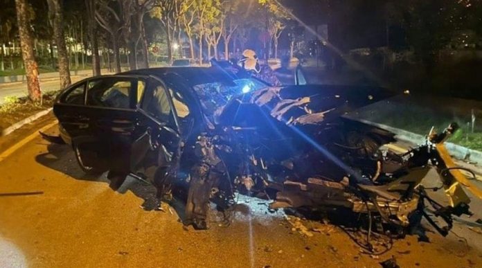 据了解,事发时,21岁华裔青年所驾驶的马赛地轿车,疑似失控撞向路边的一棵树,相信是撞击力过猛,车头引擎脱离车身,直接被撞飞出去,整辆车毁不成形。