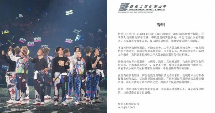 演唱会总承办商“艺能工程有限公司”30日晚发声明对伤者、其家属及受影响人士致以最深切慰问,并盼受伤者能早日康复。同时亦指对公司很重视安全::“整个演唱会舞台的制作,由构思、设计、安装及运作,均由多个单位负责与协商。作为承办单位之一,正主动、积极及真诚地配合主办单位、政府专责小组及其他相关单位的调查,希望尽快彻查事故原因。”