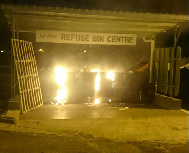 砂拉越中砂 3垃圾槽被纵火烧毁 2015年8月28日 着火的垃圾槽。 (本报诗巫27日讯)疑遭人纵火,3个垃圾槽突然失火烧毁。Advertisement 这起火患是于昨晚深夜11时发生在新珠山巴刹的土著摊。 由于这3个垃圾槽火光闪动,冒出滚滚浓烟,消防局接获民众的通知之后,消防员迅速赶至现场灭火。