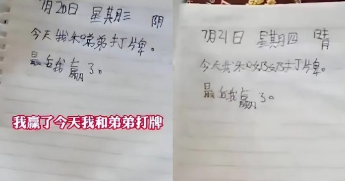 原来孩子写的日记内容,不是和爷爷打牌,就是和奶奶、弟弟打牌,没别的内容了,令她好气又好笑。