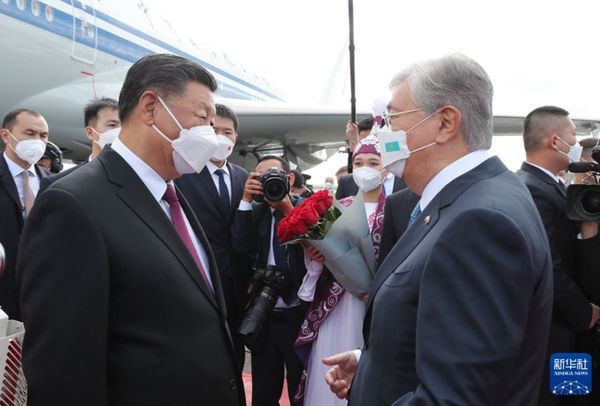 哈萨克斯坦总统办公室发布的画面显示,习近平走下舷梯后受到仪仗队的热烈欢迎,哈萨克斯坦总统托卡耶夫(Kassym-Jomart Tokayev)也到机场亲自迎接。