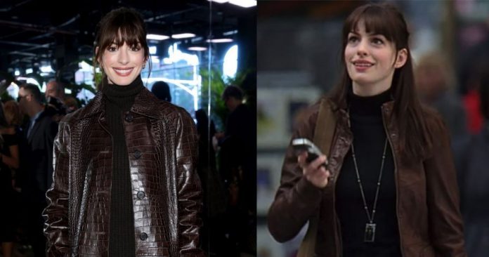 《穿著Prada的恶魔》迎来上映16周年,安妮海瑟薇出席品牌时装秀时,特地重现当年剧中造型,从黑色高领、咖啡色皮衣外套,再到浏海公主头,完美复制角色安迪萨克斯(Andy Sachs)模样。
