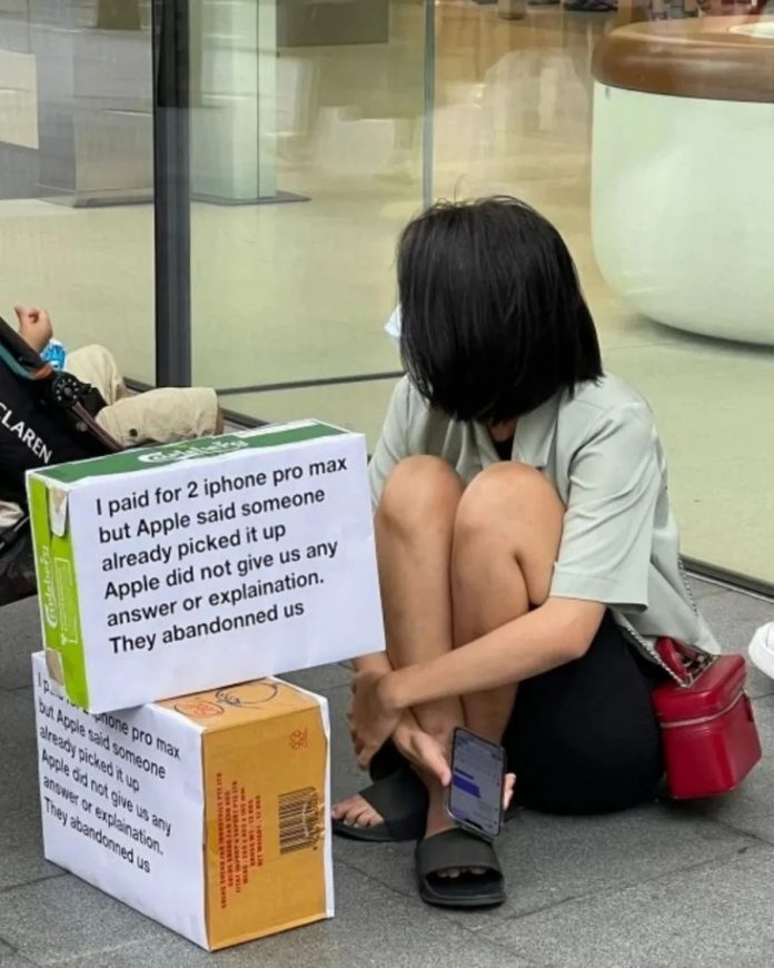 根据新加坡网媒“wake up Singapore”面子书贴文,一名女子在位于乌节路的苹果手机专卖店外,摆放两个贴著“诉状”纸箱,申诉在官网购买两台iPhone Pro Max,当她到专卖店准备提货时,却被告知手机已被人取走。