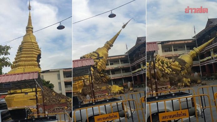 泰国因为连续下雨,清迈名刹Srisuphan Silver一座有着500多年历史的佛塔29日轰然倒塌,佛塔高超3层楼,在倒下时却丝毫没有砸到旁边的教学楼,很多民众觉得是奇迹。