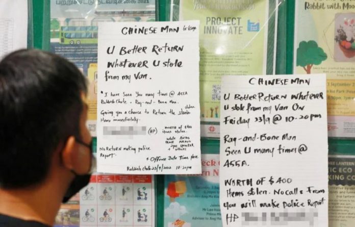 (新加坡3日讯)男子称在组屋楼下洗车时,耳机、音箱等近400新币(约1296令吉)的财物被盗,贴4张“大字报”要求归还,否则报警。