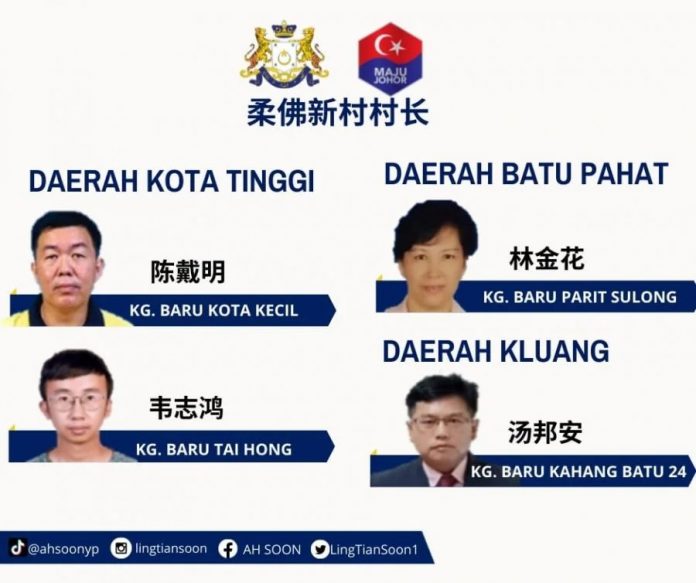 4名新委的村长分别是哥打丁宜县小哥打新村村长陈戴明、哥打丁宜县泰丰新村村长韦志鸿、峇县巴力士隆新村村长林金花及居銮县加亨24哩新村村长汤邦安。