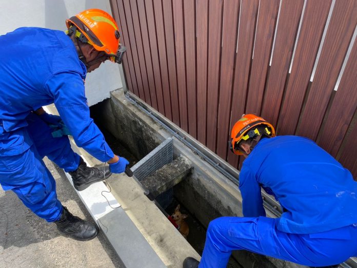 纳闽16日讯|纳闽民防部队救起一只被困在水沟的小狗。