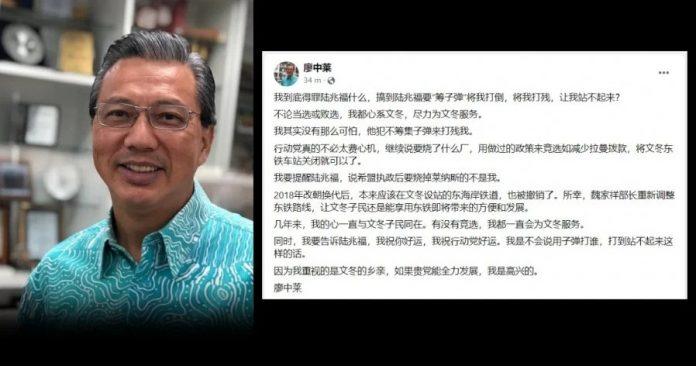 盛传可能在这届大选再战文冬国席的廖中莱今晚在面子书贴文说,自己并不可怕,陆兆福犯不著筹子弹来打倒他。