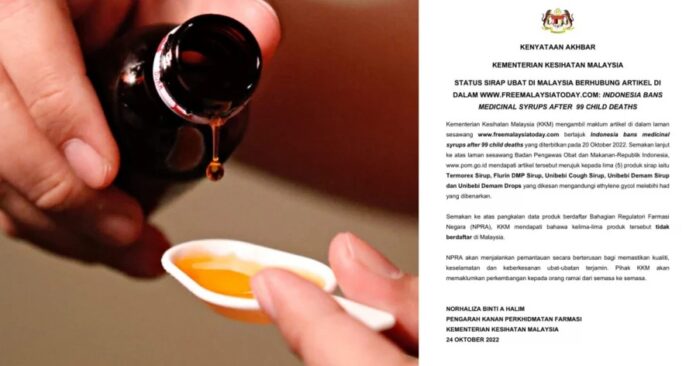 (吉隆坡24日讯)针对媒体报导印尼禁了导致99名儿童死亡的药用糖浆一事,卫生部指出,有关的5款产品皆没在大马注册。
