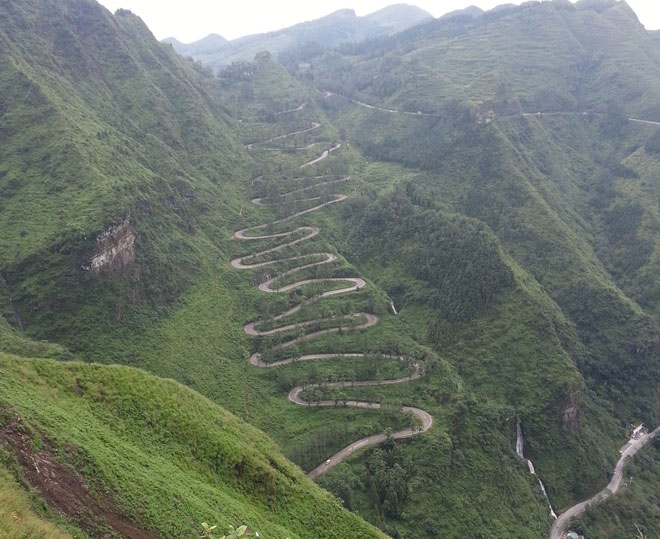三辆巴士满载外客自安南古城开往二十四道拐,在重峦叠嶂间盘旋而上,路窄得仅容得下一辆车行走,左边是陡峭的山壁,右侧窗外咫尺之遥即是万丈悬崖,如果车行稍微偏离路面,所有人就可能成为山中之鬼、壑中之魂了。