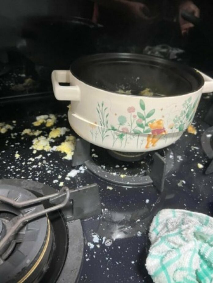 “我听到了奇怪的声音,之后回到厨房时,发现陶瓷锅爆裂,汤汁都洒落满地。”