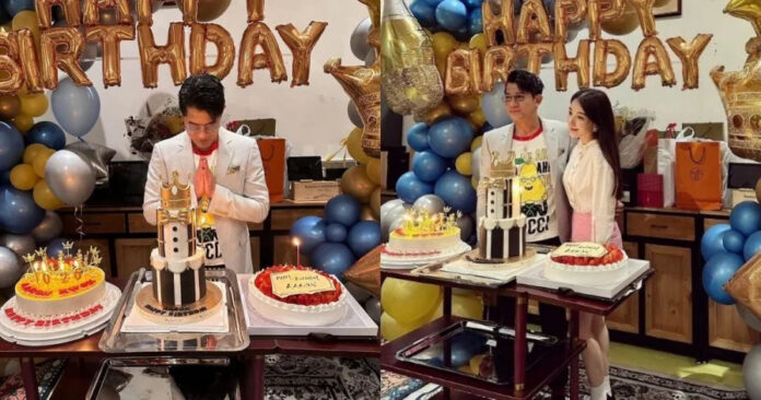 打扮一向很有心得的郭富城,生日派对又怎会马虎,生日会现场以金色、蓝色和银色气球装饰为主,拼成“AARON HAPPY BIRTHDAY”的字样,共有三个生日蛋糕,其中一个生日蛋糕是一个城堡的造型,上面有金色的蝴蝶结和皇冠,也凸显出郭富城“国王”身份,他也戴上金丝框眼镜,再配卡通T恤、浅色西装,整个打扮成熟之中又有童真,更有网民说郭富城完全没有变老,仿佛回春了20年,完胜现在时下的小鲜肉,看不出跟太太有22年的年龄差。