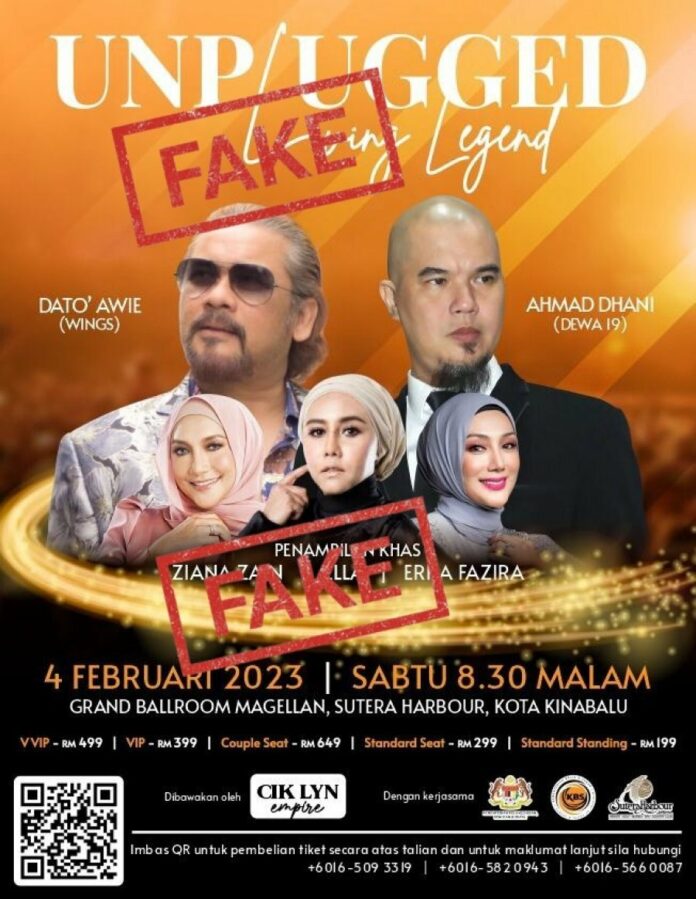 他说,骗子盗用阿威与另外4名本地歌手的头像,伪造一张明年2月4日晚上8时30分,在沙巴哥打京那峇鲁举办的演唱会,票价介于199令吉至649令吉。