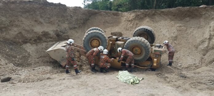 亚庇28日讯|一辆大型推土挖掘机车失控掉落20尺地面后翻覆,60岁男子司机当场毙命。