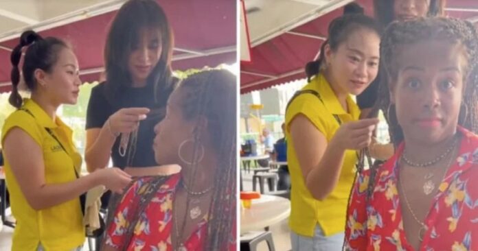 (新加坡28日讯)两名啤酒女郎在咖啡店偶遇美国女歌手,惊叹歌手头发上编织的脏辫,于是伸手去摸,上述行为被不少网友指有失尊重。啤酒妹受访称,其实事先有问准过对方,才敢摸她头发。