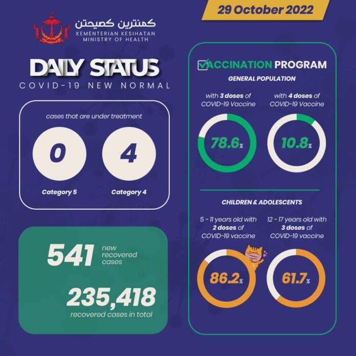 (汶莱斯市29日讯)汶莱第4类病例有4例,而病愈的人数为541人。