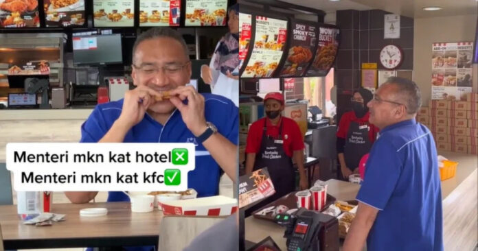 希山慕丁3天前通过其个人抖音平台帐号Hishammuddin Hussein,上载一段他到肯德基家乡鸡快餐店(KFC)吃炸鸡的视频,视频中他不仅亲切地与民众打招呼,亲自点餐甚至大方与民众拍照;该视频至今吸引逾63万浏览。