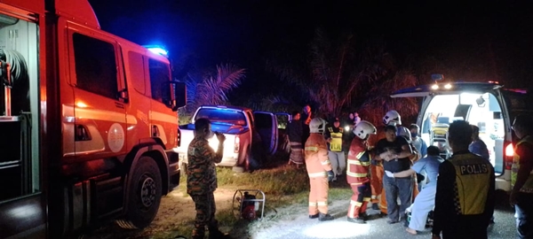 消拯队抵达现场时,发现一辆四驱车撞向油棕树后侧翻,63岁的司机受困车里动弹不得。