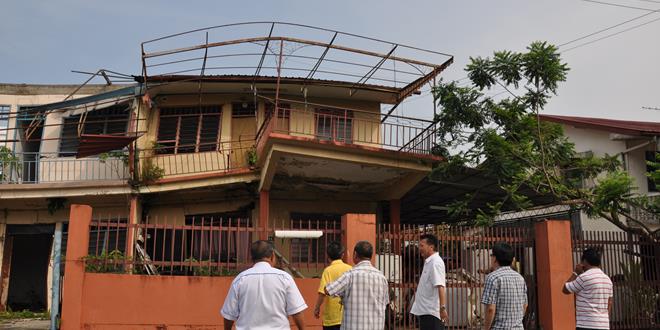 (本报诗巫5日讯)武吉阿瑟区屋子地基下陷,屋身变形的受影响双层排屋底楼空间,几乎已不能住人。