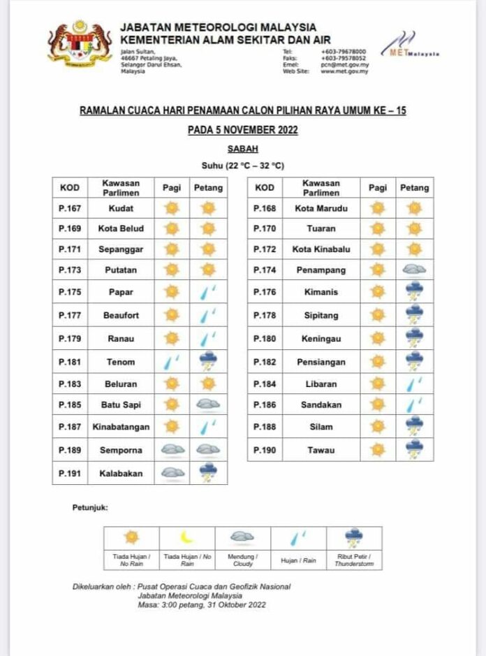 (本报1日讯)随着本周六(5日)即将迎来第15届全国大选(GE15)提名日,大马气象局预测,在全沙巴廿三个国会地区里,大部分地区早上天晴,不过下午时分过半地区会有暴雨及降雨。