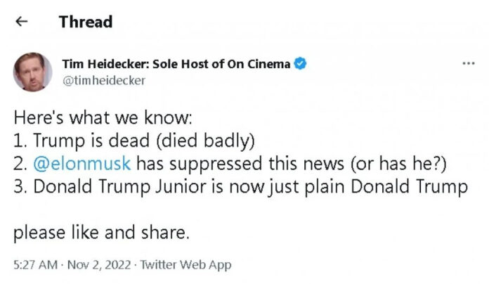 美国新闻网商业内幕(Business Insider )报导,海德克周二在已归马斯克所有的推特,带头使用“特朗普死了”(TrumpIsDead)的话题标签。