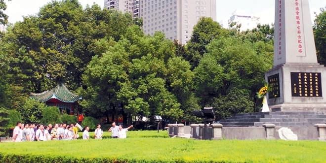 长沙有岳麓山73军阵亡將士纪念塔,常德则有第74军常德会战阵亡將士纪念塔。但与岳麓山纪念塔不同,常德阵亡將士纪念塔位在市中心被高楼包围,前往参观的人潮远比岳麓山的多。当天在常德会战阵亡將士纪念塔,就有一群组团参观的人,在塔前献上鲜花,並三鞠躬致敬。