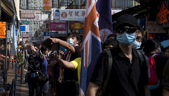(香港7日讯)香港激进本土派人士事隔半年,週日再次发起「光復」行动反中国水货客,约150人游行经龙琛路、新康街,高呼「驱蝗」及「还我寧静家园、卖国贼」等口號。沿途经过的店舖纷纷落闸避祸,店东怒斥示威者影响生意。