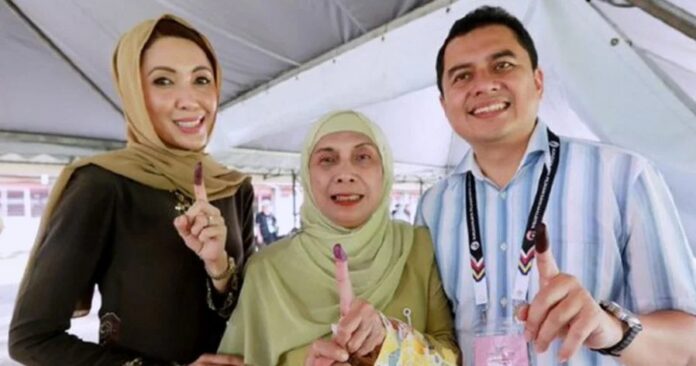 (百乐19日讯)鲜少在公众场合亮相的前首相拿督斯里纳吉的第一任妻子东姑再纳东姑依斯干达,今日现身北根,投下手中一票,以行动支持代表国阵上阵柏拉姆再也州议席的儿子拿督莫哈末尼扎。