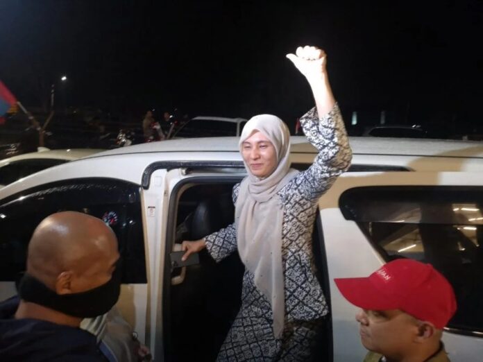 努鲁依莎是今日凌晨1时许,在夫婿任韶龙陪同下,在竞选中心和平基金大厦会见支持者。