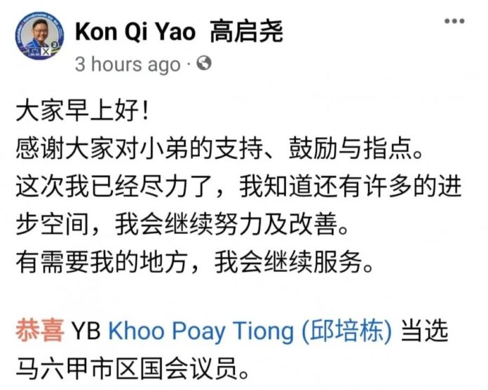 国阵马华马六甲市区候选人高启尧今日在面子书专页发布帖文,除了感谢选民所给予的支持与鼓励,也大方恭贺希望联盟行动党候选人邱培栋当选。