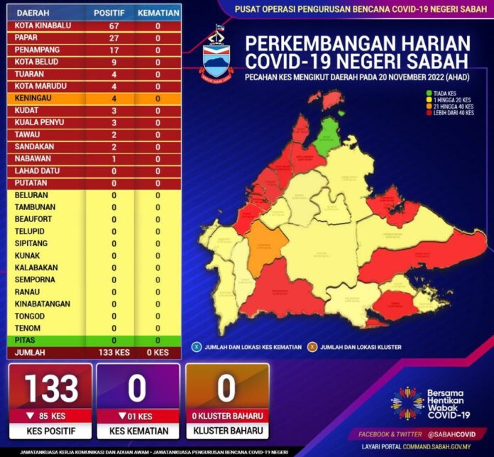 (亚庇20日讯)沙巴新冠新确诊数字今日达133宗,比昨日的218宗大减85宗。