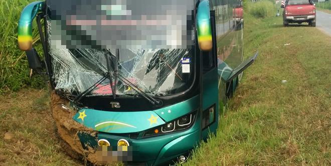 一家长途巴士公司之巴士车在行驶中突然失控连人带车撞入路旁水沟中,结果导致数人受伤流血,肇祸巴士车前大镜破裂,车头损坏。