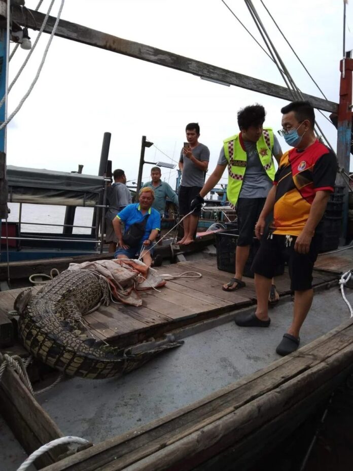 当地渔民是于今日下午4时许在老港海域,靠近网箱养鱼场处,惊见渔网网住了一条鳄鱼,在不知所措的情况下,据情向十八丁志愿消防队求助。