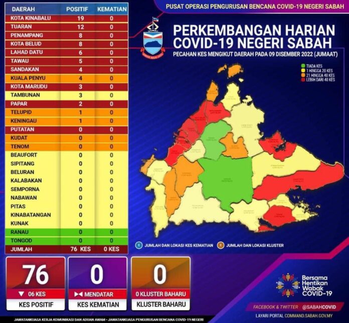 (亞庇9日訊)沙巴今日通报76宗新冠肺炎确诊病例,与昨天的总数相比略减少了 6 宗。