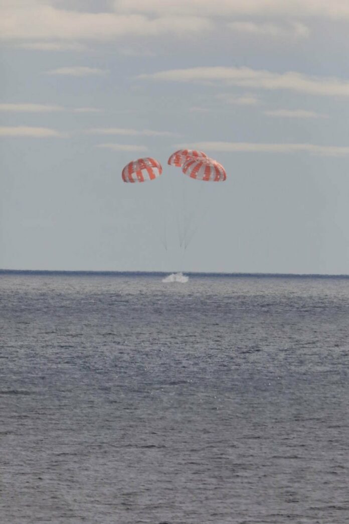 美国国家航空暨太空总署电视台(NASA TV)画面显示,猎户座太空船(Orion)以每小时4万公里的速度冲过地球大气层后,在3顶降落伞的帮助下溅落在海面上。