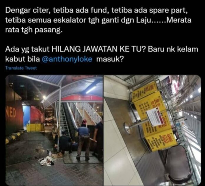 另外,一位名为Dean of Deen的推特用户则上载了两张金马律站(LRT Dang Wangi)因故障而暂停服务多时的手扶梯,正在维修的照片,并疑惑为何突然就有了资金和零件来维修手扶梯。
