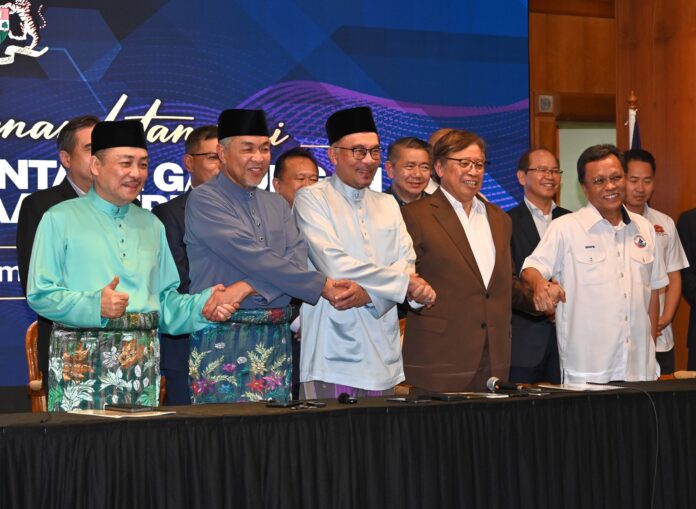 5个政党联盟的主席和秘书长签署这项协议,包括希盟主席安华、砂盟主席丹斯里阿邦佐哈里、巫统主席拿督阿末扎希、沙盟主席拿督哈芝芝及民兴党主席拿督沙菲益。