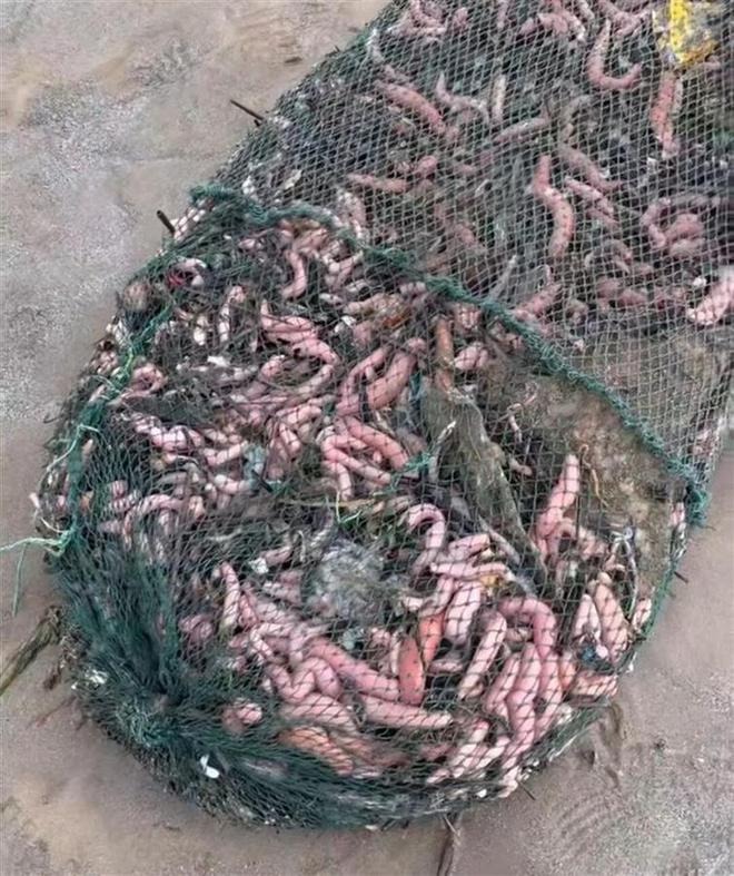据悉,周先生在16日晚就到海边,用专业拖网捞海肠。18日早上不到八点半,他又早早来到海边,直到下半夜才打道回府,当天收获了200斤海肠。