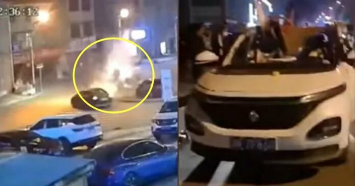 中国湖南省湘潭市近日发生一起恐怖交通事故,一辆白色休旅车在转弯时突然发生巨大爆炸,车顶瞬间被炸开,所幸司机及时逃生。