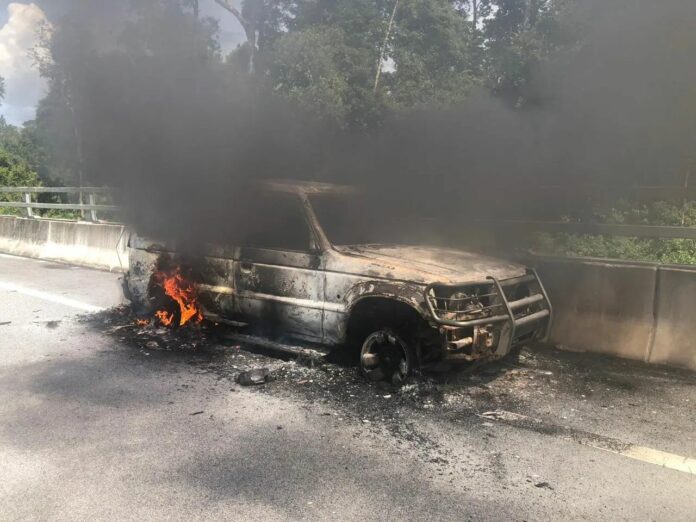 这起火烧车事故在昨日早上,在前往淡武廊县的苏丹哈吉奥玛阿里赛夫汀大桥上发生。