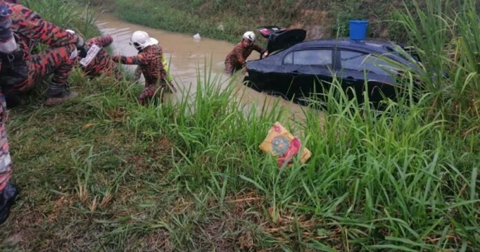 (下霹雳21日讯)一辆轿车在超车时不慎撞及水坑后失控坠入水沟,导致1死2伤。